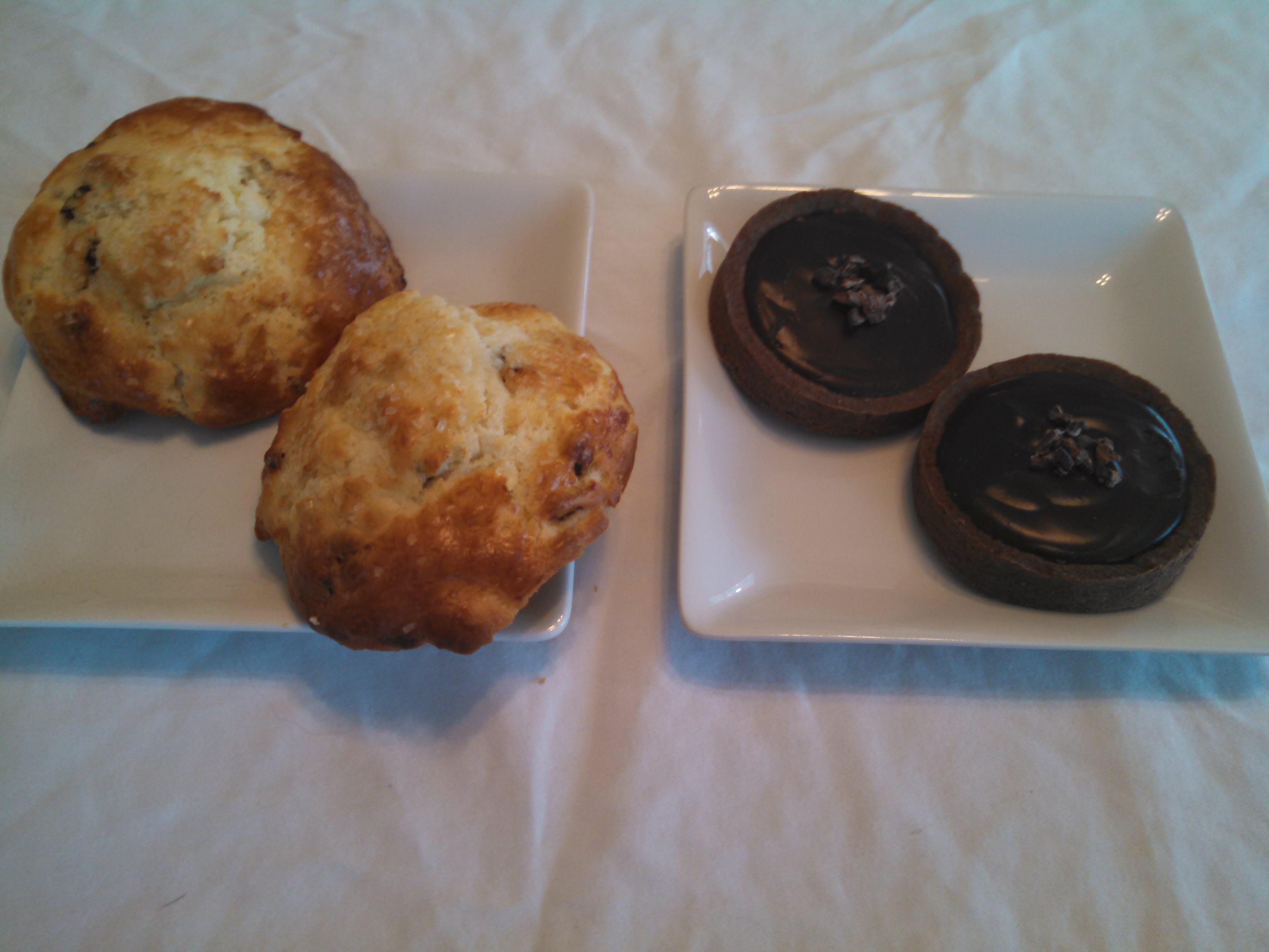 I paid a visit early this morning and came away with a supply of currant scones, two chocolate tartlets, and a double cappuccino. The cafe is warm, cozy, inviting and spacious, with hard wood floors, fresh flowers, baking books on display and a friendly and open kitchen/baking area. The food–as expected–is mouthwatering and the atmosphere delightful.