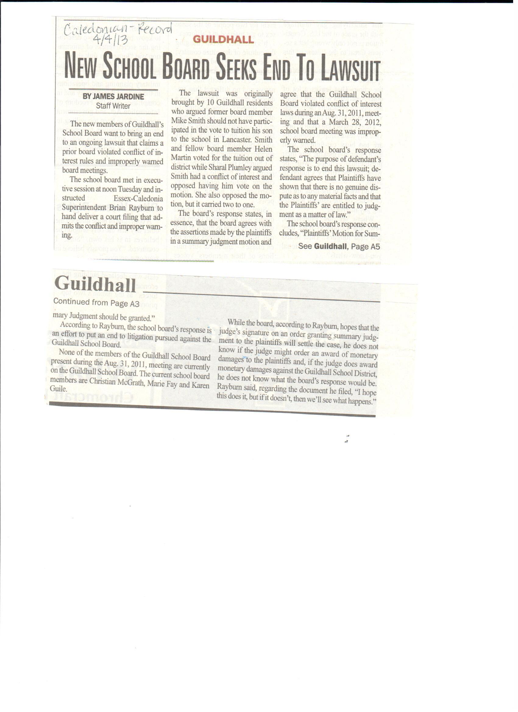 Today, as reported in the Caledonian-Record, the School Board has finally admitted publicly, to the Court, that the Board violated the law, as it relates to conflict of interest and Vermont’s open meeting law. (The School District’s Memorandum to the Court is available to the public at the Essex County Court).